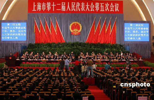 二月三日,上海市第十二届人民代表大会第五次会议在圆满完成预定的各项议程后,今天上午在上海展览中心中央大厅胜利闭幕。中新社发 汤彦俊 摄