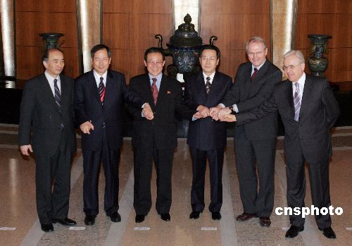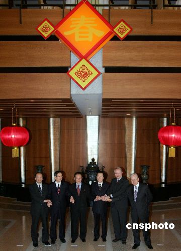 二月十三日下午,朝鲜半岛核问题第五轮六方会谈第三阶段会议在北京钓鱼台国宾馆结束。图为六方谈判代表会后集体亮相。中新社发 毛建军 摄