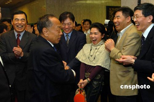 中国传统佳节即将到来之际,正在日本进行访问的中国外交部长李肇星,当地时间二月十五日晚专程来到中国驻日本大使馆看望全体工作人员,并兴致勃勃地观看了使馆工作人员的新春晚会。中新社发 王健 摄