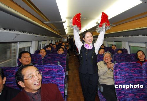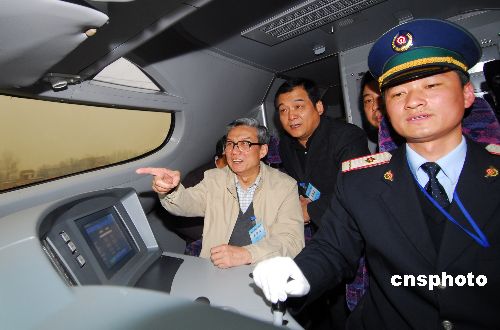 2月28日,在陕的全国人大代表登上西安至宝鸡的新型高速动车组试验列车视察铁路工作,并慰问奋战在春运一线的铁路干部职工。中新社发 唐振江 摄