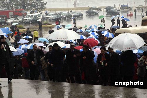 三月三日,全国政协十届五次会议在北京人民大会堂隆重开幕,来自全国各地的委员冒雨出席会议。中新社发 任海霞 摄