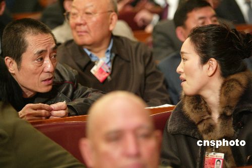 三月三日下午,全国政协十届五次会议在北京人民大会堂开幕,张艺谋委员与巩俐委员在会议开始前交谈。中新社发 杜洋 摄