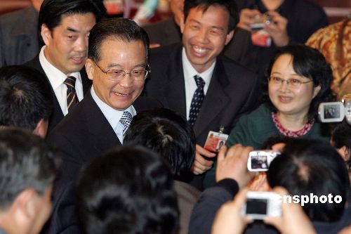 十届全国人大五次会议预备会议三月四日在北京人民大会堂举行,温家宝总理出席会议时与代表们交谈。中新社发 毛建军 摄