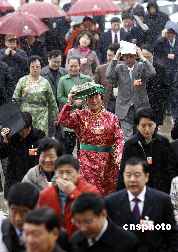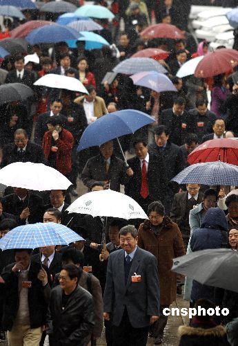 三月四日,一场意外的春雪降临北京。当天,十届全国人大五次会议预备会议在北京人民大会堂举行,参加会议的代表们在纷纷扬扬的春雪沐浴下与会。中新社发 刘新 摄