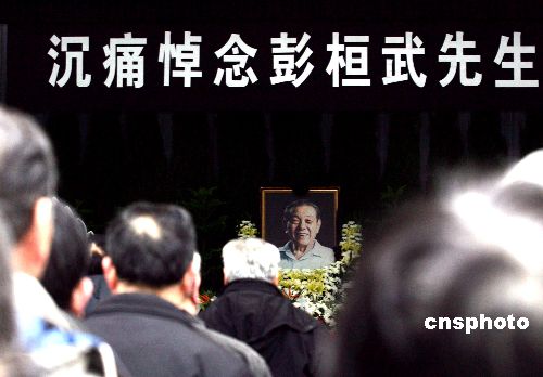 三月六日,两弹元勋、科学大师彭桓武院士遗体告别仪式在北京八宝山举行,全国人大常委会副委员长、中国科学院院长路甬祥等前往送别。彭桓武院士是中国核物理理论、中子物理理论以及核爆炸理论等各种理论的奠基人,领导并参加了核潜艇、原子弹、氢弹原理的理论研究和设计工作。彭先生因病医治无效,于二零零七年二月二十八日在北京逝世,享年九十二岁。中新社发 武仲林 摄