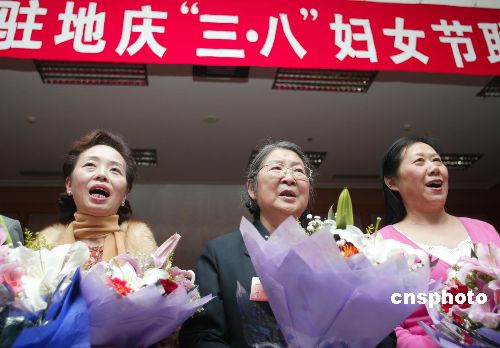 三月六日晚,全国政协委员、毛泽东的女儿李敏在会议驻地京丰宾馆参加庆“三·八”妇女节联欢,与其他女委员合唱“团结就是力量”。中新社发 杜洋 摄