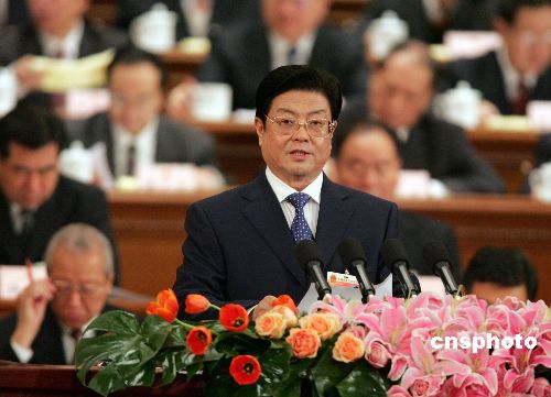 十届全国人大五次会议第二次全体会议三月八日在北京人民大会堂举行,王兆国副委员长作关于中华人民共和国物权法草案的说明。中新社发 毛建军 摄