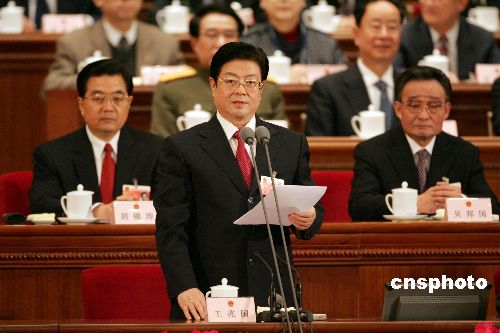十届全国人大五次会议第三次全体会议三月十一日在北京人民大会堂举行,吴邦国委员长在会上作全国人大常委会工作报告。图为王兆国副委员长主持会议。中新社发 毛建军 摄