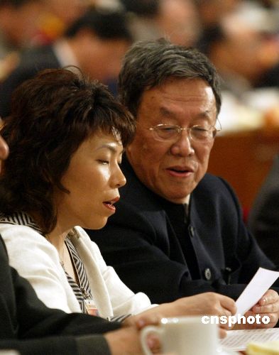 三月十二日,全国政协十届五次会议在北京人民大会堂举行第四次全体会议大会发言,全国政协委员王蒙与邓亚萍在发言后一起亲切交谈。中新社发 任海霞 摄