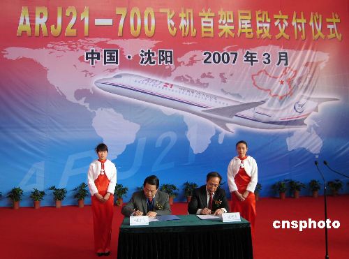 3月13日,中国首架完全拥有自主知识产权的ARJ21新型涡扇支线飞机尾段在中国一航沈阳飞机工业(集团)公司顺利交付。自此,中国第一架自主研发的ARJ21飞机将进入全面总装阶段,这标志中国航空工业民用飞机生产进入了一个新阶段。中新社发 沈殿成 摄