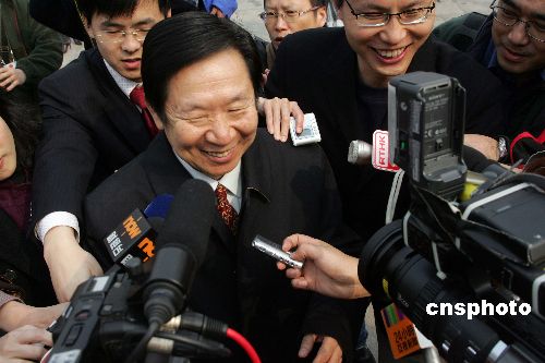 十届全国人大五次会议第四次全体会议三月十三日在北京人民大会堂举行,出席会议的全国人大代表、国务院港澳办公室常务副主任陈佐洱被香港记者围追采访。中新社发 毛建军 摄