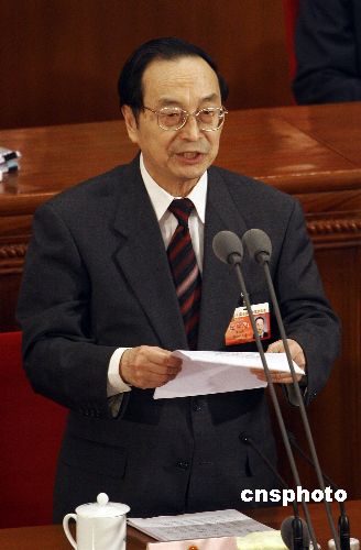 十届全国人大五次会议第四次全体会议三月十三日在北京人民大会堂举行,最高人民法院院长肖扬作最高人民法院工作报告,最高人民检察院检察长贾春旺作最高人民检察院工作报告。图为大会主席团常务主席、执行主席蒋正华主持大会。中新社发 刘新 摄