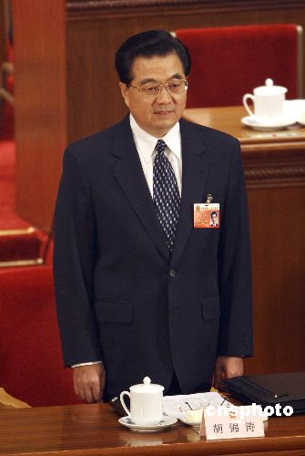 十届全国人大五次会议第四次全体会议三月十三日在北京人民大会堂举行,最高人民法院院长肖扬作最高人民法院工作报告,最高人民检察院检察长贾春旺作最高人民检察院工作报告。图为国家主席胡锦涛出席会议。中新社发 刘新 摄