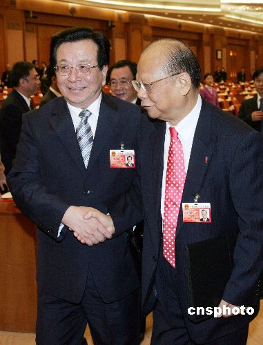 十届全国人大五次会议第三次主席团会三月十五日上午在北京人民大会堂举行,出席会议的国家副主席曾庆红与香港的全国人大代表曾宪梓一起交谈。中新社发 毛建军 摄