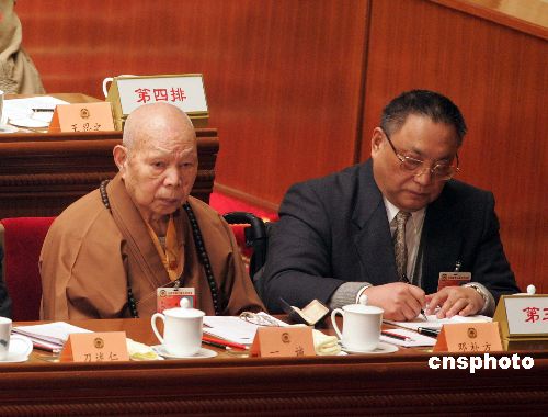 全国政协十届五次会议三月十五日上午在北京人民大会堂闭幕,一诚大和尚(左)、全国残联主席邓朴方出席会议。中新社发 毛建军 摄
