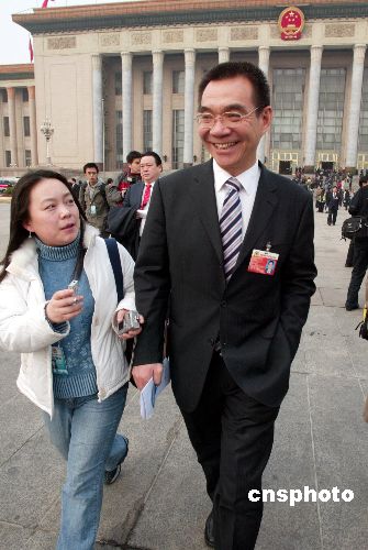 全国政协十届五次会议三月十五日上午在北京人民大会堂闭幕后,一名女记者意犹未尽追问林毅夫委员。中新社发 杜洋 摄