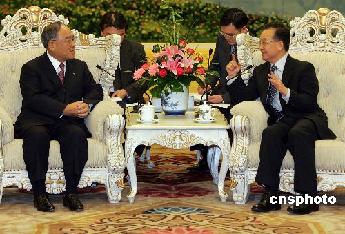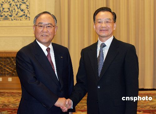 中国国务院总理温家宝三月十九日在北京人民大会堂会见来访的“中日文化体育交流年”日方实行委员会委员长御手洗富士夫一行。中新社发 毛建军 摄