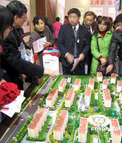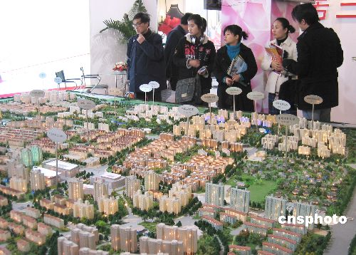 3月19日,参观者在房展中观看楼盘模型。3月16日--19日,迎着南下的冷空气,2007年上海之春房产展示交易会在上海展览中心举行。被誉为“上海楼市动态风向标”的上海之春房产展示交易会今年已是第九届,参展商比2006年少了一半,不满一百家。中新社发 井韦 摄