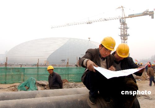 三月二十二日,北京国家大剧院施工现场,工人们正抓紧施工。根据现在的施工进度,国家大剧院主体结构将于本月底完工,其北侧围墙将在今年“五一”前拆除,于今年五月整体向世人亮相。同时,剧院内的音乐厅、戏剧院、歌剧院已经进入了安装座椅阶段,剧院吊顶亦完成了工作量的一半。中新社发 廖攀 摄