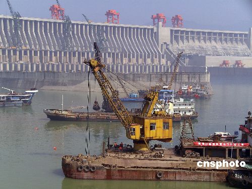 3月27日,湖北宜昌葛洲坝集团的施工船队在对三峡大坝右岸三期下游围堰进行水下开挖。据悉,2002年三峡导流明渠截流后形成的三峡三期下游围堰,是保护三峡右岸大坝施工基坑的安全屏障。随着三峡大坝全线到顶,其历史使命已经完成。三峡大坝右岸三期下游围堰水下开挖量约85万立方米,计划2007年6月15日前完工,届时三峡工程大型水下开挖施工项目将全部完成。中新社发 刘君凤 摄