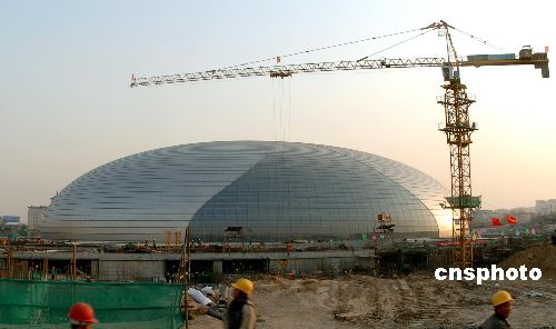 3月27日傍晚,北京人民大会堂西侧的国家大剧院在进行收尾工程,5月1日之前该工程围墙将拆除,7月投入使用。日前大剧院开始招聘315名工作人员,应聘者已逾1500人。国家大剧院总建筑面积约16.5万平方米,其中主体建筑10.5万平方米,地下附属设施6万平方米,分别由一个2500座位的歌剧院、一个2000座位的音乐厅、一个1200座位的戏剧场和一个300至500座位的小剧场四大部分,及艺术展廊、表演艺术研究交流部、艺术商店、快餐厅、咖啡厅和地下停车场等配套设施组成。中新社发 邹宪 摄
