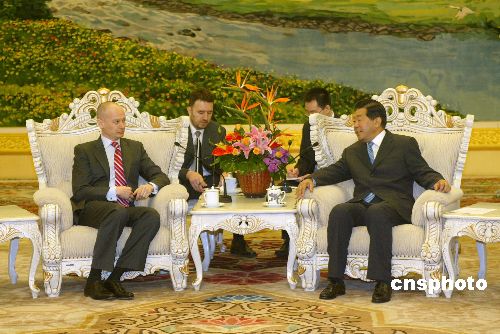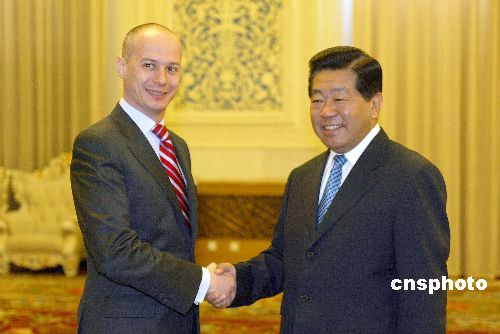 三月二十九日,全国政协主席贾庆林在北京人民大会堂会见来访的罗马尼亚众议长奥尔泰亚努。中新社发 盛佳鹏 摄
