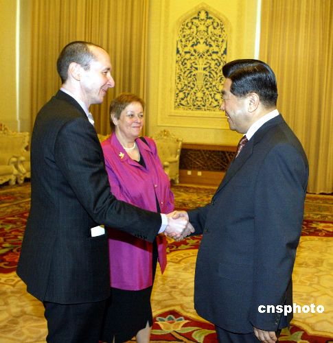 四月四日,全国政协主席贾庆林在北京人民大会堂会见奥地利联邦议会副议长哈泽尔巴赫访华团一行。中新社发 任海霞 摄