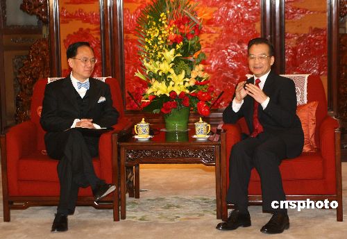 四月九日,国务院总理温家宝在北京会见香港特别行政区行政长官曾荫权。中新社发 廖文静 摄