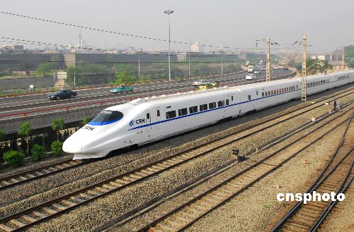 4月11日,一列“CRH”高速列车从西安古城墙北门前飞驰而过。当日,西安铁路局在陇海线西安至宝鸡间进行时速200公里动车组高速列车全程模拟运行试验,为铁路第六次大提速作最后的准备工作。4月18日,全国铁路将实施第六次大提速。届时,西安至宝鸡间将正式开行中国西部唯一时速200公里的动车组高速列车。中新社发 唐振江 摄