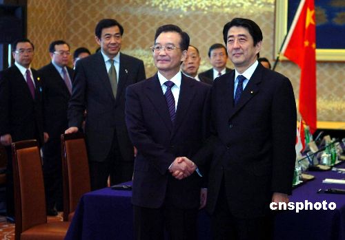 四月十二日下午,中日经济高层对话机制正式启动。正在日本访问的中国总理温家宝和日本首相安倍晋三一同出席了在东京举行的该机制启动会议。中新社发 王健 摄