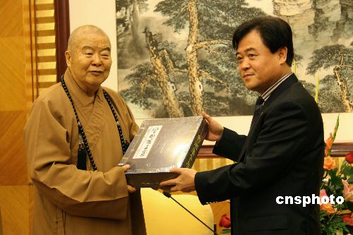 四月十六日晚,湖南省副省长贺同新会见正在长沙参访的台湾佛教界高僧星云大师,并向他赠送曾国藩全集。中新社发 刘双双 摄