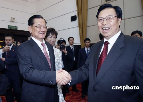 四月十六日,郑州,河南省委书记徐光春会见中国国民党荣誉主席连战时握手。当日,连战一行抵达河南访问。中新社发 慎重 摄