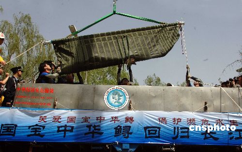 4月20日,在北京海洋馆疗养的因回游长江产卵而受伤的中华鲟已康复,准备从湖北荆州放归长江。同时,北京海洋馆“中华鲟康复中心”还将陆续收治受伤的野生中华鲟,治疗康复后再放归长江。中新社发 张宇 摄