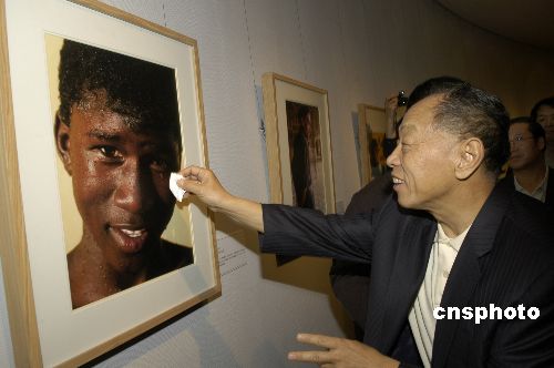 “追逐太阳的光影——邓伟捐赠摄影艺术作品展”于2007年4月20日至26日在中国美术馆举行。此次展览将集中展出邓伟向中国美术馆捐赠的100幅摄影作品,人物肖像照片包括美国前总统乔治·布什、建筑大师贝聿铭、以色列前总理拉宾等共100幅。图为外交部长李肇星为作品中的人物“擦汗”。中新社发 张爱东 摄