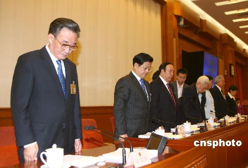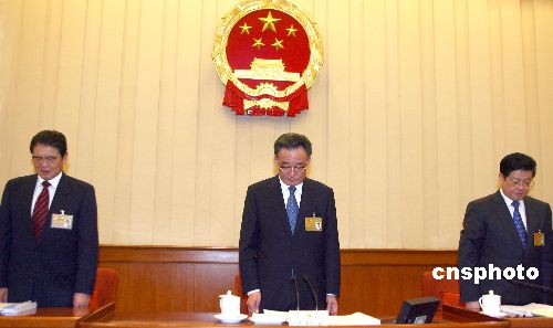四月二十四日,十届全国人大常委会第二十七次会议在北京人民大会堂开幕。全国人大常委会委员长吴邦国等领导人在会议前向逝世的全国人大常委会副委员长傅铁山默哀。中新社发 廖文静 摄
