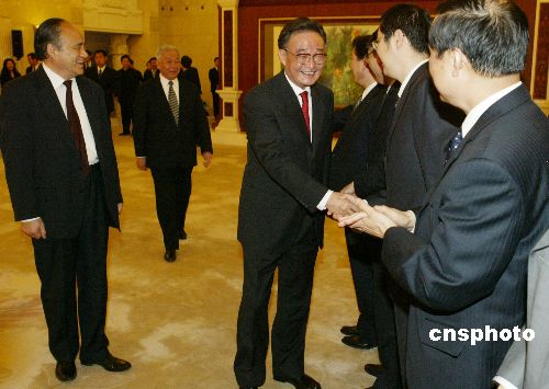 四月二十七日,吴邦国委员长在北京人民大会堂接见参加2007中华环保世纪行活动的代表和记者并讲话。中新社发 任海霞 摄