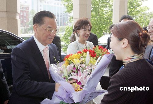 四月二十七日下午,前来出席第三届两岸经贸文化论坛的中国国民党荣誉主席连战抵达北京饭店,受到热烈欢迎。中新社发 毛建军 摄