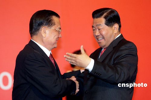 四月二十八日,第三届两岸经贸文化论坛在北京人民大会堂开幕,中共中央政治局常委、全国政协主席贾庆林与中国国民党荣誉主席连战出席开幕式并发表演讲。图为贾庆林与连战在开幕式结束时互致问候。中新社发 盛佳鹏 摄