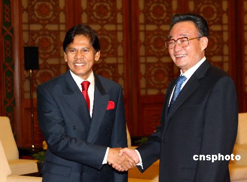 四月二十八日,全国人大常委会委员长吴邦国在北京会见了由拉姆利议长率领的马来西亚国会下议院代表团。中新社发 廖文静 摄