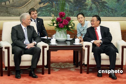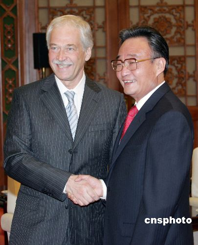 五月十四日,中国全国人大常委会委员长吴邦国在北京人民大会堂会见来访的俄罗斯国家杜马主席格雷兹洛夫。中新社发 毛建军 摄