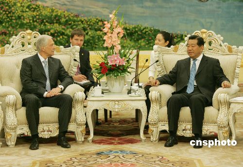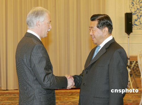 五月十五日,中国全国政协主席贾庆林在北京人民大会堂会见来访的俄罗斯国家杜马主席格雷兹洛夫。中新社发 毛建军 摄