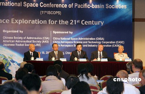 | 五月十六日,由中、美、日三国宇航团体共同发起的环太平洋地区国际空间会议在北京举行其第十一届盛会,来自中外航天专家、科技人员一百多人与会,他们将围绕“二十一世纪的空间探索”这一主题,展开非官方的广泛研讨与深入交流。中国宇航学会理事长、中国航天科技集团公司总经理张庆伟,国际宇航联程序委员会主席、美国宇航学会代表Peter Bainum,日本火箭学会理事长Takuji Murakami分别在开幕式上代表会议发起方致辞。中新社发 孙自法 摄