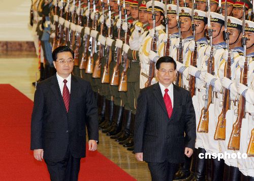 五月十七日,中国国家主席胡锦涛在北京人民大会堂举行仪式,欢迎来访的越南国家主席阮明哲。中新社发 毛建军 摄