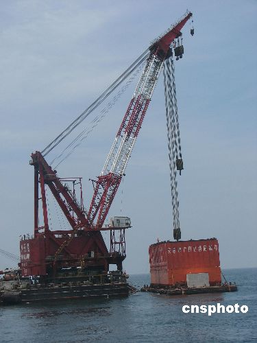 重达五百三十吨的“南海一号”打捞沉井在五月十七日下午已经完全入水,十七日的阳江海域是本月天气最好的一天。 从上午十时左右起,负责起吊沉井的“南天龙”号开始伸出它的巨臂,下午三时左右,沉井完全没入海面入水,到了三时三十分左右,沉井入水深度约为五米。由于现场拒绝采访,沉井安置状态如何尚为未知数。 图为“南天龙”开始起吊沉井。中新社发 索有为 摄
