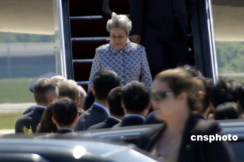 当地时间5月21日,中国国家主席胡锦涛特使、国务院副总理吴仪率团抵达美国首都华盛顿。吴仪一行将出席22日在华盛顿开幕的第二次中美战略经济对话,在此次战略经济对话中,中美贸易、汇率、能源、环保、服务业、创新和知识产权、平衡发展、透明度等将成为讨论焦点。中新社发 邱江波 摄