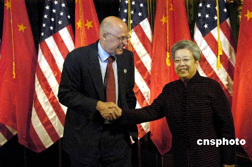 当地时间5月22日,第二次中美战略经济对话在美国华盛顿开幕,中国国务院副总理吴仪和美国财政部长保尔森作为两国元首特别代表,共同主持对话会。在第二次中美战略经济对话开幕前,中美两国元首的特别代表、本次对话的共同主持人吴仪副总理和鲍尔森部长短暂会晤。中新社发 邱江波 摄