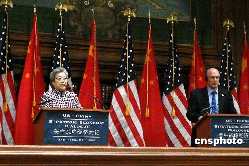 当地时间5月23日,第二次中美战略经济对话在华盛顿闭幕,中国国家主席胡锦涛特别代表、国务院副总理吴仪和美国总统布什特别代表、财政部长鲍尔森共同主持闭幕式,吴仪和鲍尔森在评价对话取得的成果时说,本次对话取得了若干共识并取得了一些成果。中新社发 邱江波 摄