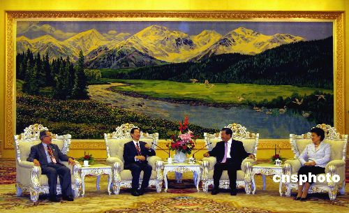 五月三十日,中共中央政治局常委、全国政协主席贾庆林(右二)在北京会见了旅港福建商会访问团一行。全国政协副主席、中共中央统战部部长刘延东(右一)等陪同会见。中新社发 徐长安 摄