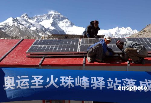 5月30日,“奥运珠峰驿站落成仪式暨亮点工程”在珠峰大本营隆重举行。参加今年珠峰大行动的全体志愿者队伍与电力工程师一起进行了剪彩和挂牌仪式。“奥运圣火珠峰驿站”自今日起将屹立在雪域高原,为2008年传递奥运会圣火的西藏登山队员提供休息和训练的场所。中新社发 陈斌 摄