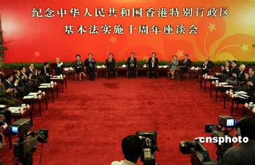 六月六日上午,纪念中华人民共和国香港特别行政区基本法实施十周年座谈会在北京人民大会堂举行。中新社发 毛建军 摄
